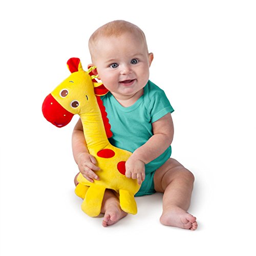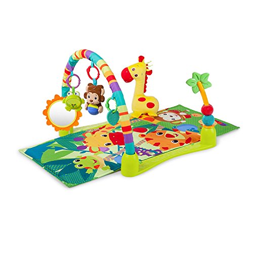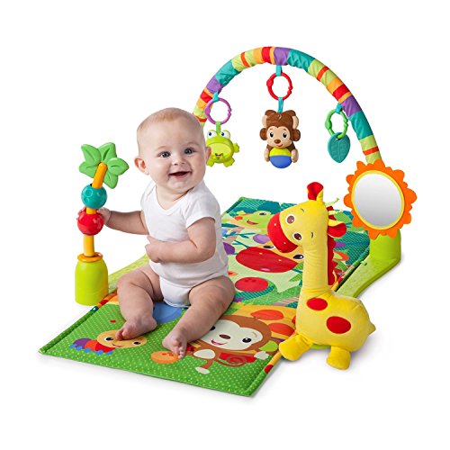 Bright Starts Jungle Discovery Activity Gym is a unique gym that features plenty of toys in an open environment. With one toy bar, there's plenty of room for kicking and later, for sitting. The large plush giraffe is perfect for cuddling. The dangling monkey entices baby with a spinner ball that activates silly sounds and melodies. The palm tree engages baby with sliding balls. Baby's little hands will love exploring the baby-safe mirror, frog with a rattle belly, and a leaf-shaped tether. A great place to lay and play now, and sit and play later. Fun comes first.