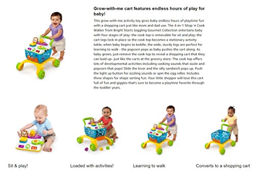 このgrow-with-meアクティビティおもちゃは、お母さんやお父さんのような買い物カゴで、遊びの楽しみの無限の時間を与える。明るいスタートからの4in1 Shop 'n Cook Walker Giggling Gourmet Collectionは、4段階の遊びで赤ちゃんを楽しませます:クックトップは座りと遊びのために取り外し可能です。カートレッグは所定の位置に固定され、クックトップは静止した活動テーブルになる。赤ちゃんがおしゃべりし始めたら、丈夫で広い脚が歩き方を学ぶのに最適です - ポップコーンは赤ちゃんがカートをプッシュするときにポップです!赤ちゃんが成長するにつれて、食料品店のカートのように、買い物をすることができるショッピングカートが表示されます。料理トップには、調子の良い音や、ポップコーンのポップコーンなど、さまざまな発達活動があります!レバーをスライドさせて、愚かなサンドイッチがポップアップします。ライトアップボタンを押すと音が鳴り、卵ローラーが回転します。シェイプソートの楽しみのために3つのシェイプを含みます。あなたの小さな買い物客は、幼児の年を通して遊び心のあるお気に入りになるのは間違いない、このカートを楽しんでくれるでしょう!