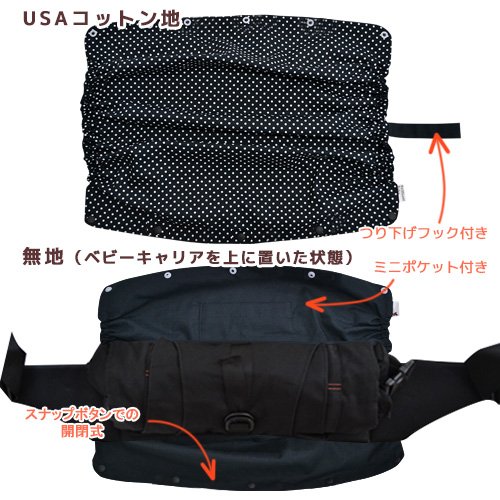 抱っこ紐不使用時のカバーとしてお使いいただけます。 くるくると纏めた抱っこ紐に巻きつけ、スナップボタンをとめるだけ 持ち運びや収納時の抱っこ紐がおしゃれに変身。 たためばコンパクトになるのでお出かけにも邪魔になりません。 腰につければウエストバッグ、肩にかければハンドバッグ、ななめ掛けにかければボディバッグ風に おしゃれなお母さんへファッションのワンポイントとしておすすめです。