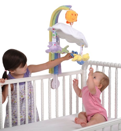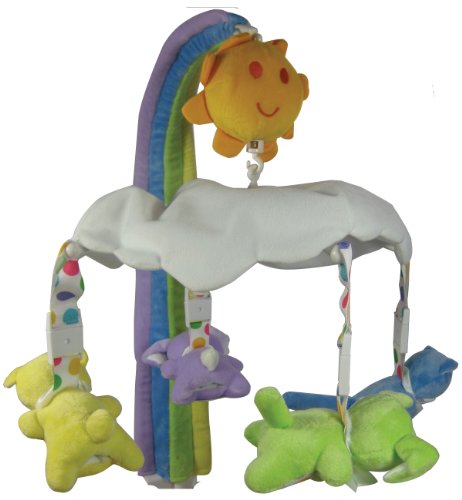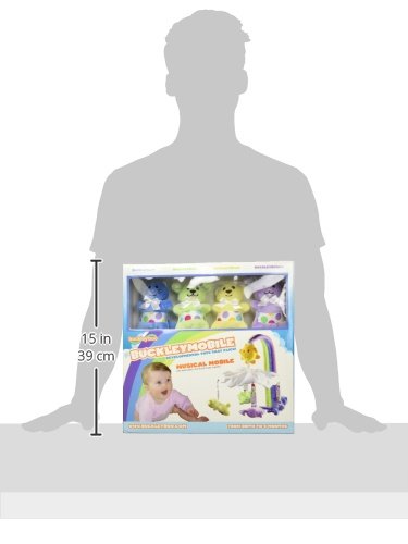 Wind-up mobile plays Brahms' Lullaby;4 removable Click Buddies buckle into the cloud canopy and are positioned for baby's viewing.;Stage 2: Buckling - At eighteen months, children are ready to buckle, but they cannot yet unbuckle, which makes BuckleyBoo, for a time, a toy to be shared between parent and child.;Sturdy arm easily attaches to any crib;Soothing and visually stimulating