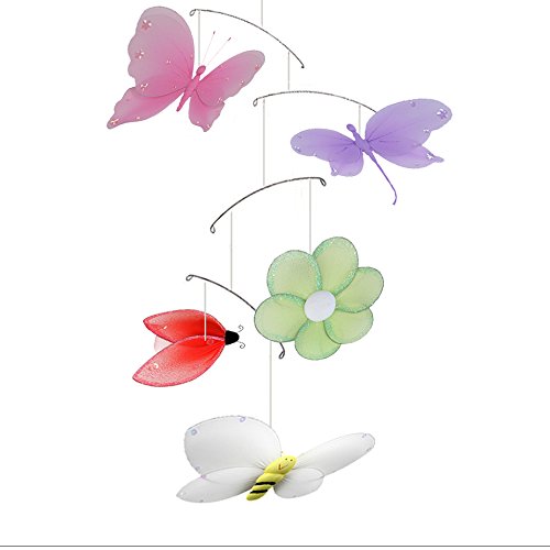 Jewel Butterfly Dragonfly Ladybug Flower Bee Nylon Mesh Mobile Decorations. Decorate a Baby Nursery Bedroom, Girls Room Hanging Ceiling Decor, Wedding Birthday Party, Bridal Baby Shower, Bathroom, Home, Butterflies Ladybugs Bees Flowers Mobiles Decoration;Ideal for baby nursery, kids bedroom, girls room & home decor. Nylon hanging ceiling mobile is a perfect nursery mobile with 5 mesh bugs and blooms (butterfly, ladybug, dragonfly, bee and flower) with wings accented with pretty sequins, glitter. These pretty organza hanging decorations are made with a soft bendable wire frame. This 5 piece pre-assembled ceiling hanging mobile has adorable 5 W x 4 H butterfly, dragonfly, bee and a 5 diameter flower, and a 4w x 3 ladybug.;These pretty mesh nylon butterflies, dragonflies, ladybugs, bees and daisies are made with a soft bendable wire frame. These hanging mobiiles are perfect to hang from the ceiling above a changing table, crib or the corner of a room. Ceiling hardware not included. Perfect for spaces such as child's bedrooms, baby nursery rooms, play areas.;Bugs & bloom are pre-strung with clear line and hoop for easy hanging from the ceiling. Mobile hangs approximately 24 long. Does not attach to cribs, these mobiles hang from the ceiling. Do not play music or wind up to spin. Visit our Amazon store for more great items: www.amazon.com/shops/Bugs-n-Blooms;Please note: Sizes are approximate, handmade and variances may occur. Additional colors, sizes, & styles are available, please see store for details. Please visit our Amazon store on 'How To Hang' for tips and suggestions: http://www.amazon.com/gp/aag/details/ref=dp_mi_seller_details?ie=UTF8&seller=A2RFZLVKNCOP5I#custom