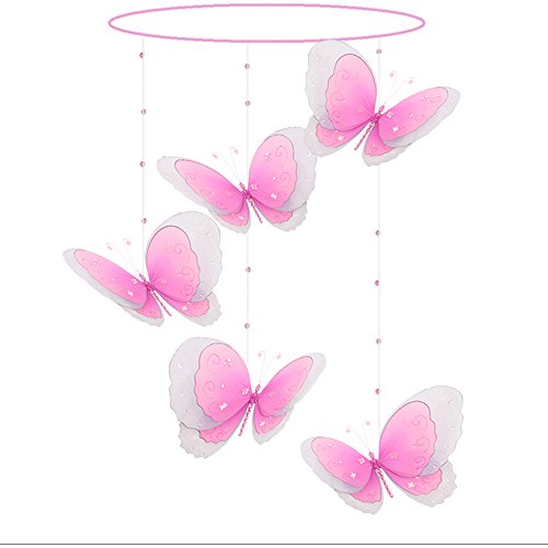 Butterfly Mobile Dark Pink (Fuchsia) Multi-Layered Spiral Nylon Mesh Butterflies Mobiles Decorations. Decorate a Baby Nursery Bedroom, Girls Room Hanging Ceiling Decor, Wedding Birthday Party, Bridal Baby Shower, Bathroom, Home, Playroom, Kids, Childrens Nursery Mobile Decoration, 3D Art DIY Craft;Ideal for baby nursery, kids bedroom, girls room & home decor. Nylon hanging butterfly mobile is a perfect nursery mobile with 5 mesh butterflies have multi-layered wings, beaded body, glitter and sequins. These pretty organza butterfly decorations are made with a soft bendable wire frame. This cute pre-assembled mobile has five (5) 5 W x 4 H butterflies which hang from a color matched round hoop frame allowing the butterfly to spin and twirl independently.;These pretty mesh nylon butterflies are made with a soft bendable wire frame. These hanging mobiiles are perfect to hang from the ceiling above a changing table, crib or the corner of a room. Ceiling hardware not included. Perfect for spaces such as child's bedrooms, baby nursery rooms, play areas.;Butterflies are pre-strung with clear line and hoop for easy hanging from the ceiling. Mobile hangs approximately 24 long. Does not attach to cribs, these mobiles hang from the ceiling. Do not play music or wind up to spin. Visit our Amazon store for more great items: www.amazon.com/shops/Bugs-n-Blooms;Please note: Sizes are approximate, handmade and variances may occur. Additional colors, sizes, & styles are available, please see store for details. Please visit our Amazon store on 'How To Hang' for tips and suggestions: http://www.amazon.com/gp/aag/details/ref=dp_mi_seller_details?ie=UTF8&seller=A2RFZLVKNCOP5I#custom