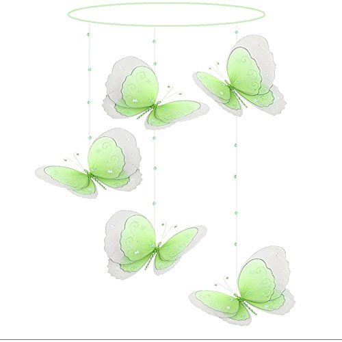 Butterfly Mobile Green Multi-Layered Spiral Nylon Mesh Butterflies Mobiles Decorations. Decorate a Baby Nursery Bedroom, Girls Room Hanging Ceiling Decor, Wedding Birthday Party, Bridal Baby Shower, Bathroom, Home, Playroom, Kids, Childrens Nursery Mobile Decoration, 3D Art DIY Craft;Ideal for baby nursery, kids bedroom, girls room & home decor. Nylon hanging butterfly mobile is a perfect nursery mobile with 5 mesh butterflies have multi-layered wings, beaded body, glitter and sequins. These pretty organza butterfly decorations are made with a soft bendable wire frame. This cute pre-assembled mobile has five (5) 5 W x 4 H butterflies which hang from a color matched round hoop frame allowing the butterfly to spin and twirl independently.;These pretty mesh nylon butterflies are made with a soft bendable wire frame. These hanging mobiiles are perfect to hang from the ceiling above a changing table, crib or the corner of a room. Ceiling hardware not included. Perfect for spaces such as child's bedrooms, baby nursery rooms, play areas.;Butterflies are pre-strung with clear line and hoop for easy hanging from the ceiling. Mobile hangs approximately 24 long. Does not attach to cribs, these mobiles hang from the ceiling. Do not play music or wind up to spin. Visit our Amazon store for more great items: www.amazon.com/shops/Bugs-n-Blooms;Please note: Sizes are approximate, handmade and variances may occur. Additional colors, sizes, & styles are available, please see store for details. Please visit our Amazon store on 'How To Hang' for tips and suggestions: http://www.amazon.com/gp/aag/details/ref=dp_mi_seller_details?ie=UTF8&seller=A2RFZLVKNCOP5I#custom