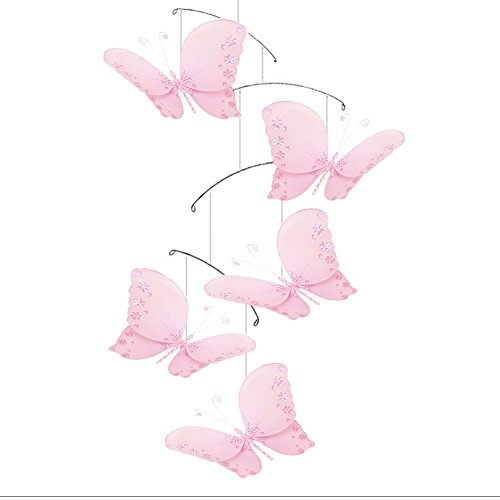Butterfly Mobile Pink Twinkle Nylon Mesh Butterflies Mobiles Decorations. Decorate a Baby Nursery Bedroom, Girls Room Hanging Ceiling Decor, Wedding Birthday Party, Bridal Baby Shower, Bathroom. Kids Childrens Nursery Mobile Decoration, 3D Art DIY Craft;Ideal for baby nursery, kids bedroom, girls room & home decor. Nylon hanging butterfly mobile is a perfect nursery mobile with 5 mesh butterflies have pretty twinkling color matched flower & round shaped sequins on the center and tips of the wings. These pretty organza butterfly decorations are made with a soft bendable wire frame. This 5 piece pre-assembled ceiling hanging mobile has adorable 5 W x 4 H butterflies.;These pretty mesh nylon butterflies are made with a soft bendable wire frame. These hanging mobiiles are perfect to hang from the ceiling above a changing table, crib or the corner of a room. Ceiling hardware not included. Perfect for spaces such as child's bedrooms, baby nursery rooms, play areas.;Butterflies are pre-strung with clear line and hoop for easy hanging from the ceiling. Mobile hangs approximately 24 long. Does not attach to cribs, these mobiles hang from the ceiling. Do not play music or wind up to spin. Visit our Amazon store for more great items: www.amazon.com/shops/Bugs-n-Blooms;Please note: Sizes are approximate, handmade and variances may occur. Additional colors, sizes, & styles are available, please see store for details. Please visit our Amazon store on 'How To Hang' for tips and suggestions: http://www.amazon.com/gp/aag/details/ref=dp_mi_seller_details?ie=UTF8&seller=A2RFZLVKNCOP5I#custom