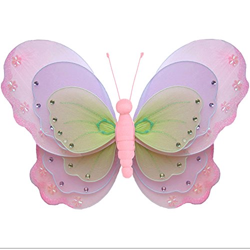 - 蝶の3色ピンクパープル&グリーントリプル構造のナイロンメッシュ壁天井の蝶のデコレーションです。柔らかいワイヤーフレームでできて子ども部屋、ベッドルーム、パーティー、ベビーシャワー、結婚式やご自宅に吊り下げ飾りです。同じ色のスパンコール、グリッター、表面は生地ナイロンを垂らしたバタフライがデザインアクセントに重ねられた3ウィングとボディを作成します。