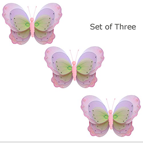 Set of 3 : HangingバタフライピンクパープルグリーンTriple Layeredナイロンメッシュ蝶赤ちゃん保育園寝室女の子部屋天井壁装飾ウェディング誕生日パーティーブライダルシャワーデコレーションbugs-n-blooms Set of 3 - Medium 10"W x 6"H 10PPUGTLBS