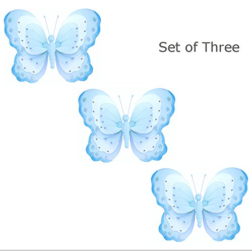 Set of 3 : HangingバタフライブルーホワイトTriple Layeredナイロンメッシュ蝶赤ちゃん保育園寝室女の子部屋天井壁装飾ウェディング誕生日パーティーブライダルシャワーPlayroomデコレーションbugs-n-blooms Set of 3 - X-Large 18"W x 11"H ブルー 18BTLBS
