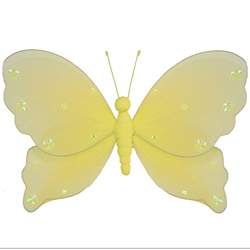 - 育児室、子供部屋に最適な女の子の部屋とホームデコレーション。同じ色の同じ色のキラキラスパンコールの細線を使用したナイロン生地を垂らした蝶が飾られ、明るい黄色が判る&かわいいファブリックボディ&アンテナです。この可愛いオーガンジーの蝶の飾りは、ソフトで折り曲げ可能なワイヤーフレームを作成することもできます