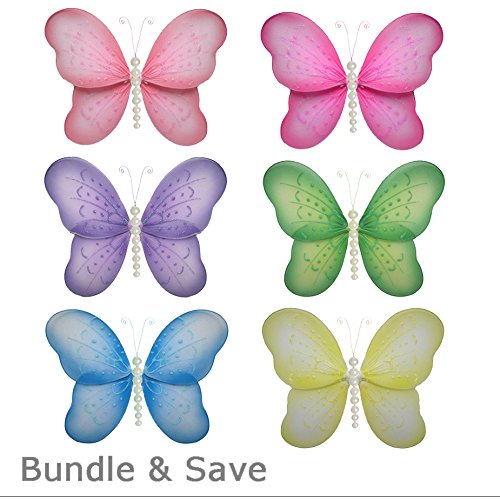 - バタフライデコレーションパールナイロンメッシュ、ハンギング蝶の装飾6点セット(ピンク、ダークピンク、パープル、イエロー、ブルー、グリーン)に対応しています。装飾として育児室寝室、プレイルーム、キッズ、子供、女子のための結婚式やベビーシャワー、バスルームの天井壁の装飾、結婚式、誕生日パーティー、ホーム、装飾3dアートクラフト