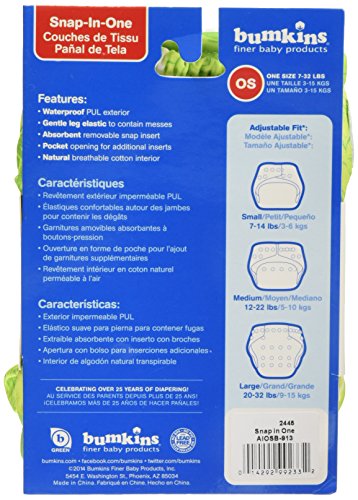 Three snap-downs on the front of the diaper allow you to easily adjust the size of the diaper as your baby grows;Fits average size babies between 7-28 lbs;Absorbency;Detachable Snap Insert features Minky fabric for comfort with interior layers of microfiber for absorbency;Opening also allows for more inserts to be added, so absorbency can be customized ( sold separately );Specially designed for fast drying;Deluxe Fabric Interior;The complete inside is covered with an entire layer of our cozy 100% cotton terry, offering baby complete comfort, keeping natural, breathable fabric next to baby's skin;Single interior fabric is easy to clean and fast drying;Waterproof Outer Shell;Waterproof outer PUL fabric with TPU is stain and odor resistant, machine washable, durable and comfortable;Extra mini leg gusset design prevents leaks;Colors remain bright wash after wash;Snap-In-One diapers feature the improved PUL fabric;New and improved PUL waterproof outer shell: soft; waterproof outer PUL fabric with TPU is stain and odor resistant; Machine washable; Durable and comfortable; Prints remain bright and colorful wash after wash;One size adjustable fit: three snap downs on the front of the diaper allow you to easily adjust the size of the diaper as your baby grows;Customizable absorbency: detachable snap insert features minky fabric for comfort with interior layers of microfiber for absorbency;?Tuck insert in to allow for natural fabric against skin or leave out for stay dry effect when needed;Deluxe fabric interior: Inside is covered with an layer of cozy cotton/bamboo rayon blend, offering baby complete comfort, keeping natural, breathable fabric next to baby's skin; Single interior fabric is easy to clean and fast drying;Bumkins cotton/bamboo snap in one insert can be added for a natural fiber option (sold separately)