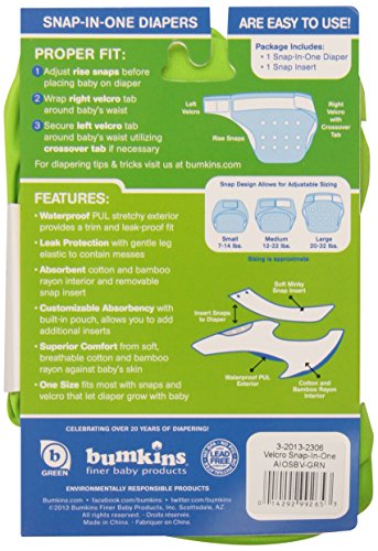 New and improved waterproof outer shell: soft; waterproof outer fabric with tpu is stain and odor resistant; machine washable; durable and comfortable; prints remain bright and colorful wash after wash;One size adjustable fit: hook and loop closure and rise snaps allow you to easily adjust the size of the diaper as your baby grows;Customizable absorbency: detachable snap insert features minky fabric for comfort with interior layers of microfiber for absorbency;?Tuck insert in to allow for natural fabric against skin - or leave out for stay-dry effect when needed;Deluxe fabric interior: inside is covered with an layer of cozy cotton/bamboo rayon blend, offering baby complete comfort, keeping natural, breathable fabric next to baby's skin; Single interior fabric is easy to clean and fast drying;Bumkins cotton/bamboo snap in one insert can be added for a natural fiber option (sold seperately)