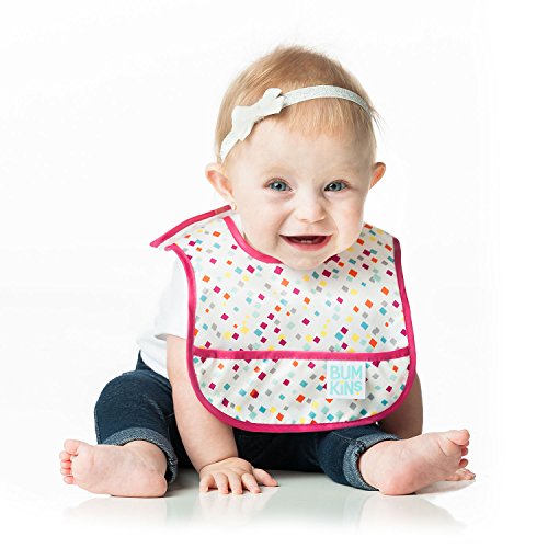 Sized to fit 6-9 months with an adjustable Velcro closure;Made from Bumkins' easy wipe, stain and odor resistant, waterproof fabric with a catch-all pocket;Machine washable, hang dry (flip pocket);Measures approximately 8 across, 6 from neck down;BPA, PVC, vinyl, phthalate and lead free