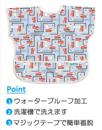 いかにも! な前掛けは卒業したい、でもまだお食事中はちょっと心配…。そんな年齢のお子様にぴったりなサイズ。袖部分に腕を通すのでずれにくく、見た目はスモックのようなビブ。留め具は、首の後ろにマジックテープ。バンキンスオリジナルのウォータープルーフ素材で汚れも簡単にふき取れる。防水加工済みで浸みこみにくく、匂い移りしにくい。ポケット付で食べこぼしをしっかりキャッチ。洗濯機で洗えてすぐ乾きます。毎日のお食事に使う物だから、お手入れカンタンなのが嬉しい。お手入れもカンタン。表面加工がされているので洗濯後も色あせにくい。Bumkinsのビブやスモックは全てPVC、BPA、フタル酸、ビニール、鉛不使用の安心素材で出来ています。Bumkins商品は、玩具や子供製品の有害物質含有量に関して厳しい基準を設けた、米国消費者製品安全性改善法(CPSIA:Consumer Product Safety Improvement Act)の基準をクリアし、カリフォルニアの州法プロポジション65の定めたガイドラインを遵守しています。プロポジション65とは、正式名称:Proposition65 Safe Drinking Water and Toxic Enforcement Act of 1986(1986年 安全飲料水および有害物質施行法)で、作業者や消費者が有害物質に暴露する可能性がある場合、事前に警告(告知)することを義務付けている米国カリフォルニアの州法です。