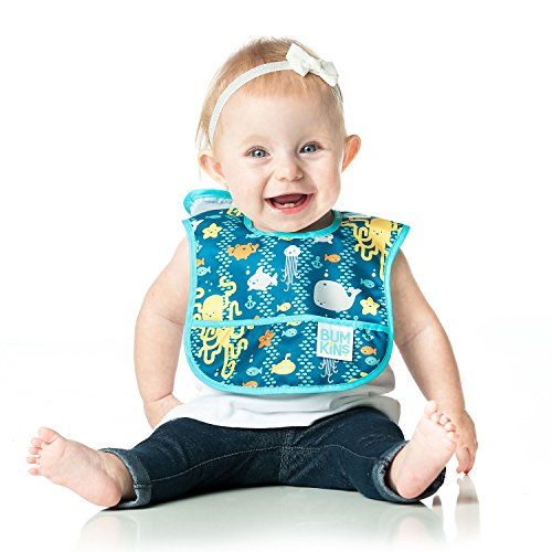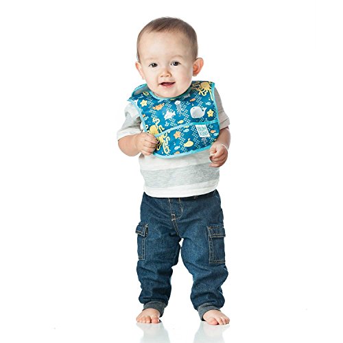 Sized to fit with an adjustable Hook and loop closure;Made from Bumkins' easy wipe, stain and odour resistant, waterproof fabric with a catch-all pocket;Machine washable, hang dry (flip pocket);Measures approximately 8 across, 6 from neck down;BPA, PVC, vinyl, phthalate and lead free