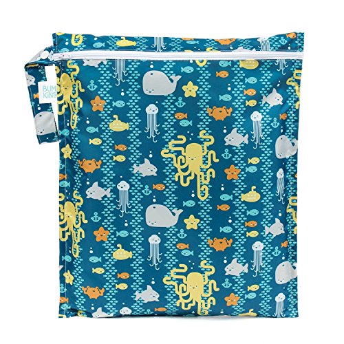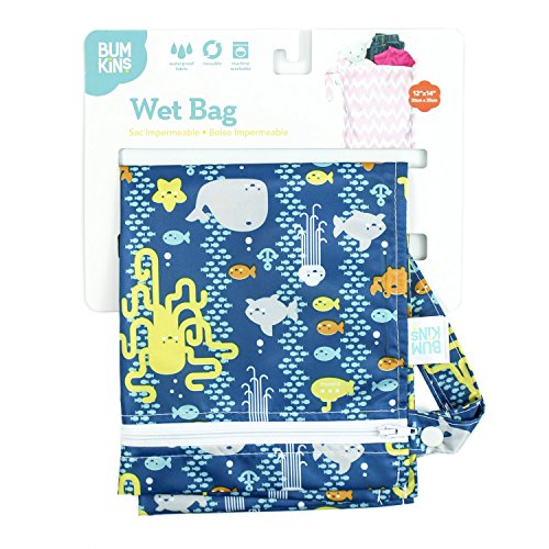 Great for cloth diapering or carrying dirty clothes or wet?swimwear;Zipper closure and snap handle with heat-sealed seams?;Made from Bumkins' easy wipe, stain and odor resistant, waterproof fabric;Machine washable, hang dry;Measures 12W x 14L