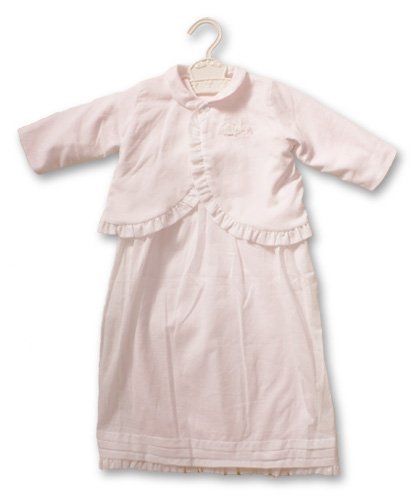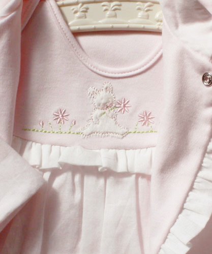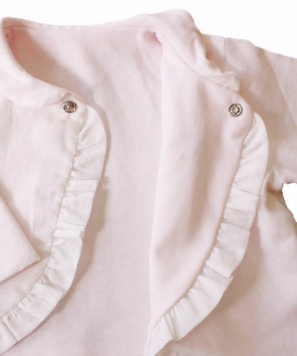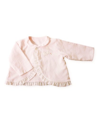 - 淡いピンクのボレロタイプのジャケッと、肌触りのいい新生児向けのドレスオールです。 柔らかい薄手のガーゼなので、春~秋のお出かけにぴったりです。 裏がふわふわコットンで、赤ちゃんの肌にもとってもやさしい♪ 胸元にかわいいうさぎの刺繍がはいっています。 ドレスは、裾はめくりあがらないようゴムがはいっているので、足をパタパタ動かしても大丈夫♪