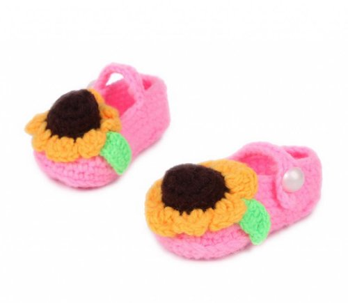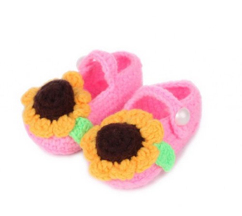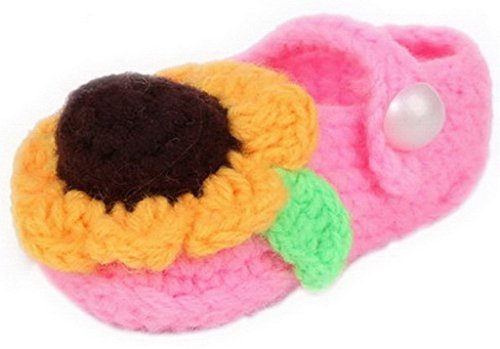 C-Princess 赤ちゃんシューズ11CM ハンドメイド手編みニットベビー靴0-18ヶ月ベビーに オールシーズン対応 軽量タイプ ベビーシューズ 女の子用可愛いひまわりデコデザイン ピンク