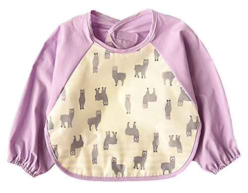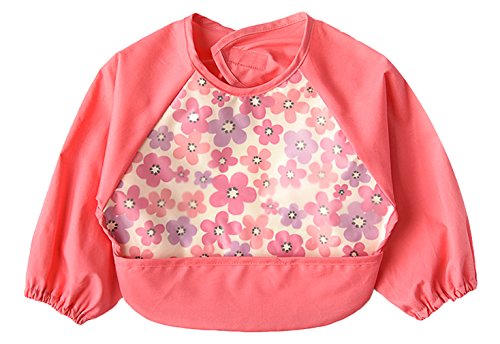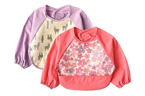 C-Princess お食事用 エプロン 2枚 長袖 スモック ビブ よだれかけ 赤ちゃん ベビー 子供 幼児 防水 食べこぼしポケット お絵かき用 泥遊び用 (M, ローズ+パープル)