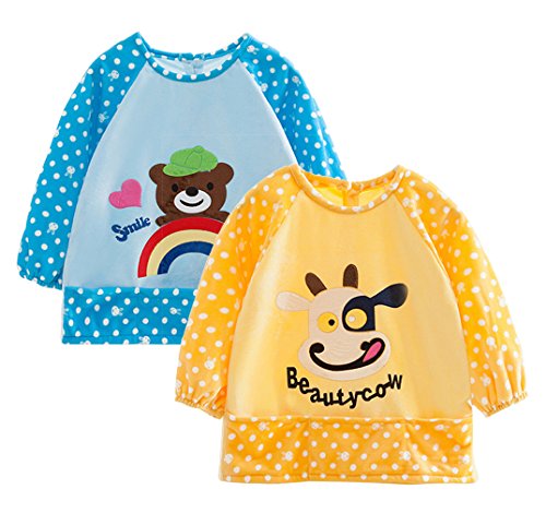 C-Princess ベビー エプロン 2枚セット 長袖 スモック 食事用 スタイ ビブ ガウン 離乳食 赤ちゃん キッズ お絵かき用 泥遊び用 可愛い 動物柄 (75, イエロー+ブルー)