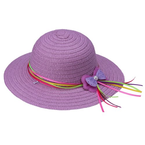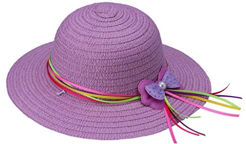 C-Princess女らしい つば広キッズ 子供用帽子 ストローハット 麦わら帽子 紫外線防止対策 UVカット バタフライ リボン飾り (1紫)