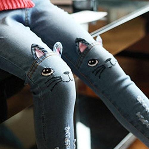 C-Princess 子供 ダメージ デニム パンツ ジーンズ ロングパンツ 長ズボン ウェストゴム キッズ ジュニア 女の子 ネコちゃん 可愛い 通園 通学 ブルー 110