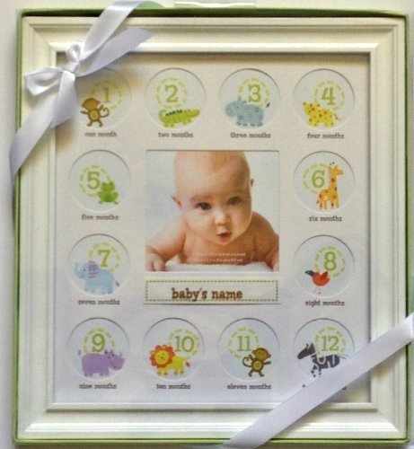 C.R. Gibson Stepping Stones Baby's First Picture Frame;Pretty White 11 x 12 Frame;Twelve Windows For Each Monthly Birthday Photos, One 3.50 x 4 Window;Each Window Has A Cute Little Animal;Name Plate To Put Baby's Name On It