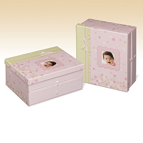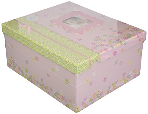Keepsake chest is archival quality, acid free and lignin free, to protect your treasures first lock of hair, birth announcement, photographs, etc;Design is complemented by satin ribbon, spot glitter and a photo frame on the lid;Meadowlark design features pink and green flowers on a soft pink background with green patterned border and pink ribbon check out the entire meadowlark collection;Chest is 12.375 wide x 10.25 tall x 6 deep and the top compartment is large enough to hold a bound memory book or baby's first pair of shoes;Carter's and CR Gibson share a commitment to quality product and beautiful design, and both have 140 years experience creating products for babies and their parents