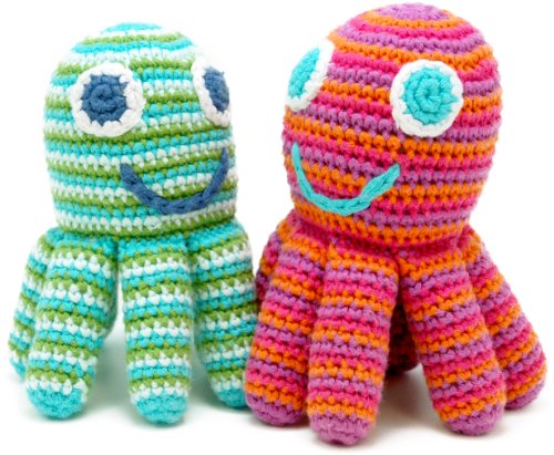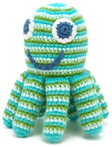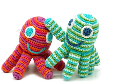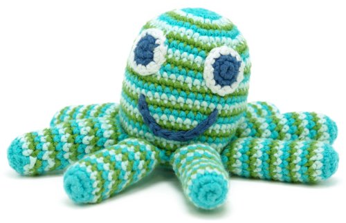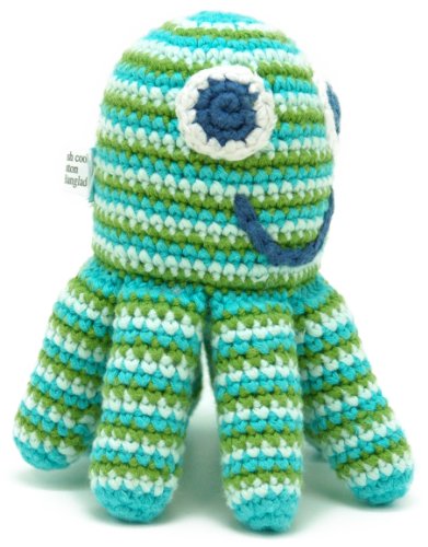 A fair trade crocheted green and blue octopus rattle, hand made from organic cotton. He is smiley and friendly and very brightly coloured and his 8 legs are just perfect for grabbing onto! Machine Washable and suitable for new born babies.