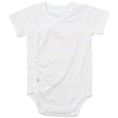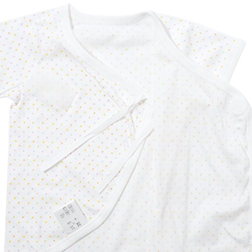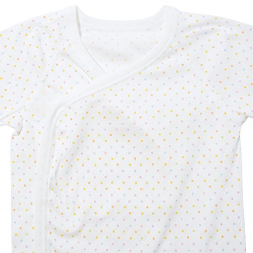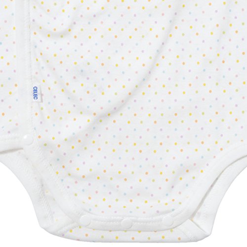 新生児の肌はデリケートなので肌の乾燥やムレを防ぐために肌着を着せてあげてください。 赤ちゃんは体温調節機能が未発達なので、上手に体温調節ができないので肌着には体温を調節する役割があります。 また、汗で体を冷やしてしまわないよう吸収性がよく、デリケートな肌に直接触れるので、素材の柔らかさや縫製の仕方など安全な物作りが大切です。 CELECの肌着は肌にやさしく安全で、素材の柔らかさを追求した上質な綿、汗をいっぱいかいても安心できる吸収性、寒さを予防できる保温性、洗濯の耐久性を高めています。 また日本製であるのはもちろんのこと織り・編みから染色、縫製まで全ての工程を日本で行っています。 フライス編地にカラフルなドット柄のプリントを施し、可愛さを表現した肌着です。フライス編地は肌着の定番商品で、吸収性、吸湿性があり、オールシーズン着せられます。 高級エジプト綿を使っているので滑らかな手触りで、繰り返しの洗濯による型崩れや毛羽立ちも少ないです。 深い打ち合わせで元気よく動いてもはだけにくく、胸元はマジックテープなので、手軽にお着替えができ、股下はスナップボタンなので、おむつ替えがしやすいです。 体にほどよくフィットし、上からウェアを重ね着してももたつきがありません。インナーとしてはもちろん季節によっては一枚でも着られます。 縫製は赤ちゃんのデリケートな肌を守るため、縫い代のごろつきをなくし、縫い目を表側にしています。 ・縫い目がごろつかない特殊なミシンを使っています。 ・縫い目を表面にして直接肌に触れないようにしています。 ・縁取りテープの厚みにこだわり、どの体勢でも肌を傷めないように考えています。 ・表示ラベルについても肌に直接触れない配慮をしています。