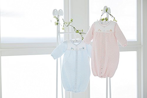 見た目も素材も涼しくて爽やかなドレス&カバーオールです。 前開きなのでお着替えもしやすくまた内股のスナップボタンを外すだけでおむつ替えができます。 サッカー織物生地の凹凸をニットの変形編みで作っています。 凹凸があるので肌に密着せず、汗吸性が高いので爽やかな着心地です。 白地に先染めの細ボーダー柄は上品で愛らしさを表現しています。 くまさんが積み木遊びしている刺繍がとてもキュートです。 ボタンの付け替えで、ドレスタイプとカバーオールの2通りの着方ができるので長い期間お使いいただけます。