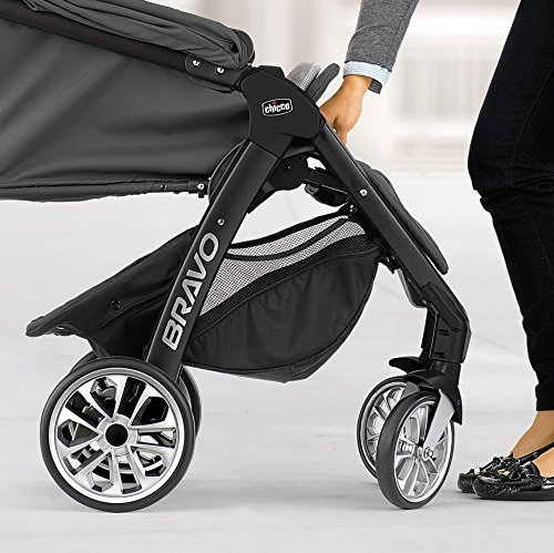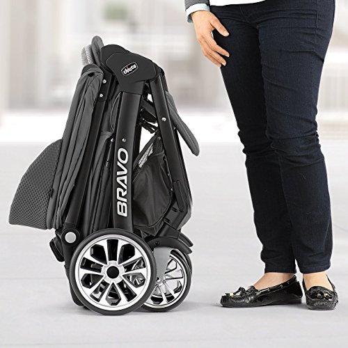 The Bravo Trio System is the new, innovative tri-modal stroller platform from Chicco. The Bravo Trio System is designed exclusively for use with the #1 rated Chicco Key Fit 30 Infant Car Seat. The Bravo provides three unique modes of use to adapt to your changing travel needs as baby grows. In its first mode for use with young infants, Bravo functions as a lightweight and stylish car seat carrier. The Bravo seat and canopy can be removed easily revealing a lightweight car seat carrier - most helpful when baby is always in the Key Fit. During the transition time when baby still rides in the Key Fit but may also like to sit up and see the world from the stroller, the Bravo functions as a travel system. When your baby outgrows the Key Fit, the Bravo is a full featured toddler stroller perfect for everyday travel for your growing baby. The Bravo Stroller features the smartest quick fold in its class. Simply lift up using the handle under the seat, and the front wheels swivel into position for a compact, free-standing fold. Key Fit Carrier: In its first mode for use with infants, Bravo functions as a lightweight car seat carrier. It's easy to remove the stroller seat and canopy, attach the child snack tray, and click in the Key Fit. Travel System: During the transition time when baby rides in the Key Fit but also likes to sit up in the Bravo, the Key Fit easily clicks in and out of the stroller seat, attaching onto the child snack tray. Toddler Stroller: When baby outgrows the Key Fit, Bravo functions as a full-featured stroller for everyday travel up to 50 pounds. Key Fit Infant Car Seat is not included with Bravo Stroller Other Features: Height-adjustable handle and parent tray with cup holders and zippered storage Removable child snack tray Reversible seat insert Premium embossed fabrics Multi-position reclining seat All-wheel suspension and linked rear brakes Large basket, easily accessible from front or rear.