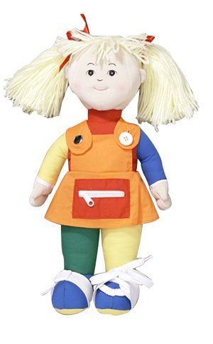 Rag dolls with embroidered faces feature five dressing skills: a snap, shoe laces, zipper, button, and buckle. Machine washable, dryable.
