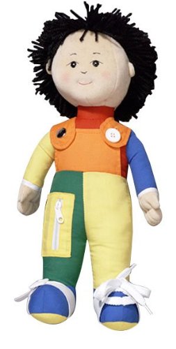 Rag dolls with embroidered faces feature five dressing skills: a snap, shoe laces, zipper, button, and buckle. Machine washable, dryable.