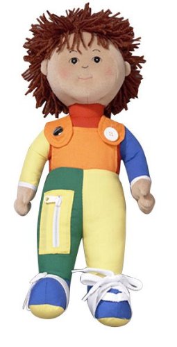 Rag dolls with embroidered faces feature five dressing skills: a snap, shoe laces, zipper, button, and buckle. Machine washable, dryable.