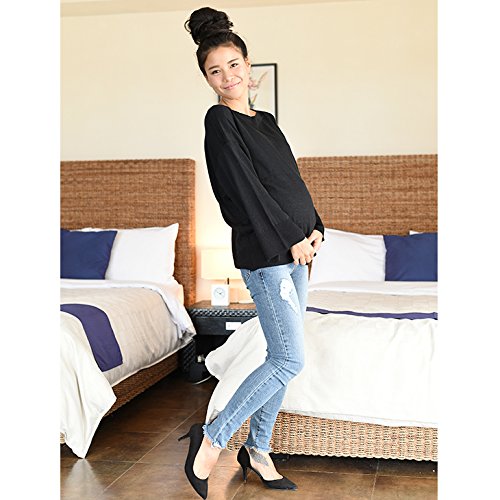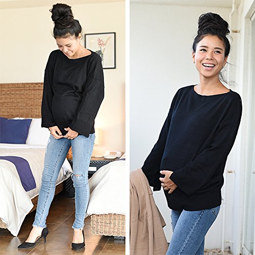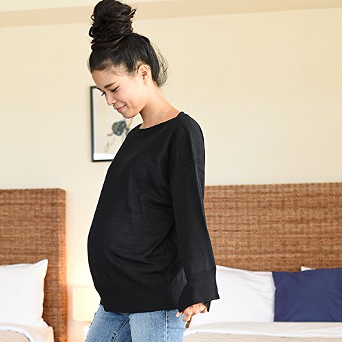 シンプルなデザインにボートネックの首元が程よいアクセントになっている薄手ニット。 お腹周りはゆるく、妊娠期も締め付け感なくノンストレスでご着用できます。 ベーシックなブラック・ベージュに加えて秋色のオリーブも登場です。
