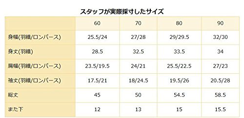 80サイズ:総長60cm/袖長20.5cm/肩幅27cm/ウエスト21.5cm