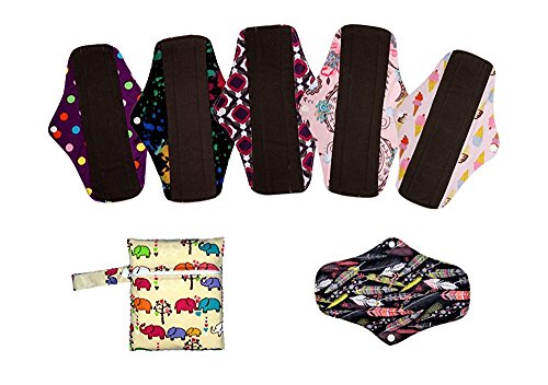 6PCS 10Inch Charcoal Bamboo Cloth Reusable Washable Menstrual Pads Sanitary Pads+1PC Wet Bag