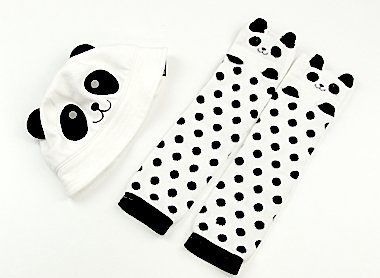 可愛いパンダさん帽子とレッグウォーマー。帽子42-44サイズ、レッグウォーマー全長29cm幅7cm×2です。全体に毛羽立ちがあり、レッグウォーマーに黒ずみ・汚れがありますが、とっても可愛いセットです。男女どちらでも使えます。