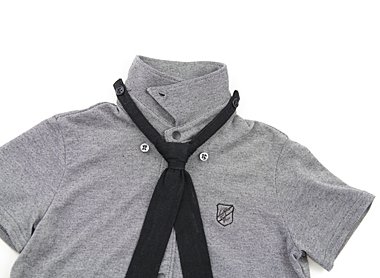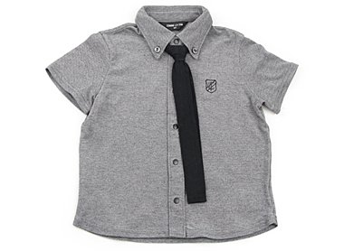 - ストレッチ性のある生地です。柔らかい生地のネクタイがセットでついています。ネクタイが少し白く汚れています。