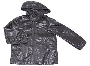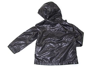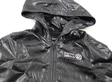 エナメルのようなツヤのある、薄く柔らかい生地。メッシュ生地の裏地がついたウインドブレーカーです。フードは丸めて衿にできる仕様でしたが、そのためのボタンが一か所欠損しています。(スペアボタンはあります)ボタンが取れた跡が穴になっていますので格安にてどうぞ。