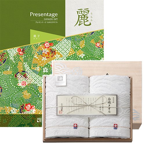 - ・●カタログギフト リンベル プレゼンテージ・麗(うらら) 〔鹿子(かのこ)〕 / ・●今治謹製 白織タオル / ・セット内容:フェイスタオル×2 / ・タオルサイズ:約フェイスタオル 約33×75cm / ・ページ数:約388ページ(内グルメ:73ページ) / ・掲載点数:約1810点(内グルメ:約190点) / ・素材:綿100% 日本製