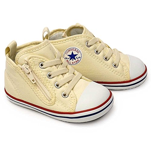 キャンバス素材を使用したコンバース・ベビーオールスターの2017年リニューアルモデルです。ゴムのシューレースと外側サイドのファスナーで履き脱ぎが容易です。ゴムのシューレースの端が縫い止めに改善されましたので、蝶結びする必要はありません。