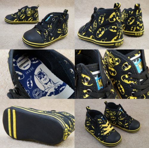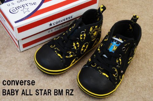 【コンバース】 ベビー オールスター BM RZ☆ 7C1018 ブラック☆ バットマンとコラボレーションしたベビー オールスターです。 1939年に出版されたコミックに初登場したダークヒーロー 「バットマン」をモチーフにデザインしました。 インソール、ライニングなど、所々にバットマンのモチーフを落とし込んだアイテムです。 外側サイドにファスナーが付いて脱ぎ履きさせやすいのも嬉しいポイント。 大人サイズもありますので親子でお揃いが楽しめます。 *足にやさしい機能* Removable insole クッション性が良く洗えて清潔 Flex Sole しなやかなソール設計 Open Tongue 大きく開いてラクラク着脱 Roomy Last 足先ひろびろゆったりラスト *ブラックとイエローのゴム紐付き。 素材*アッパー:キャンバス アウトソール:ラバー