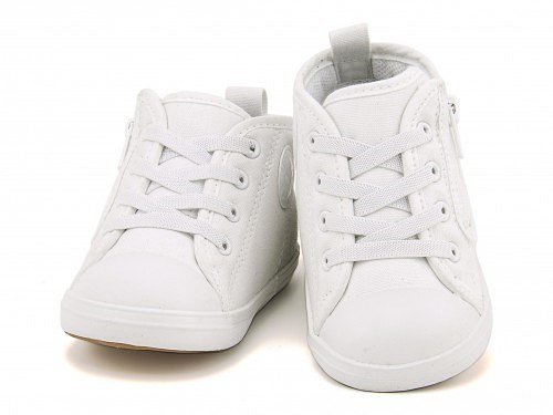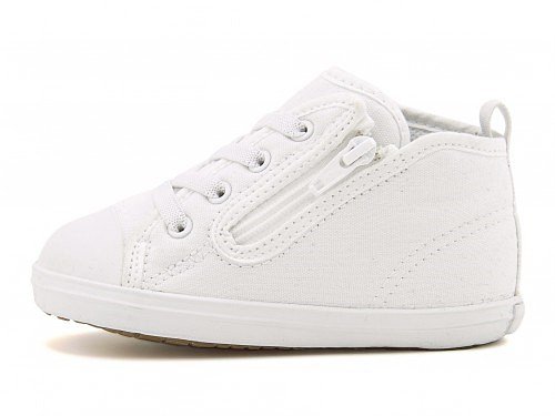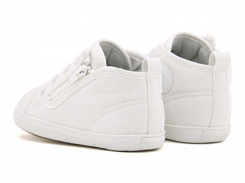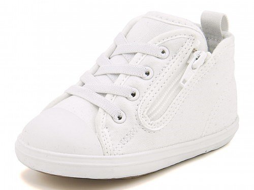 ベビーオールスター Nのホワイトプラスアレンジモデル☆ オールホワイトのアッパーデザインと、ライニングとインソールに配合されたスウェーデン発の抗菌材「ポリジン」がポイントのアイテム。つまみやすい広めのかかとテープと、サイドに設けた引っ張りやすい大きなファスナーで、脱ぎ履きしやすいデザインです。足の曲がる位置でしっかり屈曲するソール設計と厚みのあるインナーフォームを使用し、内側からシューズと足元をやさしくサポート。カップインソールにはサイズ変更の目安が分かるフィッティングチェッカー付き。ゆったりとしたラスト「ルーミーラスト」搭載で、足を自由に動かせます♪ 大人のモデルで同デザインがあるので、パパやママと親子お揃いで履ける、オシャレなファミリーペアモデルです。※展開サイズ:キッズ