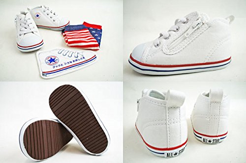 コンバース 7CJ718 ベビー スニーカー ■商品説明 BABY ALL STAR N GIFTBOX Z☆ 7CJ718☆ オプティカルホワイト☆ コンバースからギフトにオススメのファーストシューズ♪ 縫付のゴム紐仕様で解ける心配がなく、 つまみやすい広めのかかとテープ&ファスナーなので、脱ぎ履きさせやすい安心デザイン♪ 足先ひろびろ&足元を優しく包むフィットインナー、 フレックスポイント&ソールで赤ちゃんの「はじめて、歩く」をサポート♪ ギフトボックスの中にはバーズ柄のレッグウォーマーとミニ絵本も入っています♪ ホワイトのシューズ&バーズ柄レッグウォーマーは男の子にも女の子にもオシャレで可愛く履けますね♪ カワイイベビーの出産祝いやバースディプレゼントにいかがですか(*´U`*)? ■素材 アッパー キャンバス アウトソール ラバー