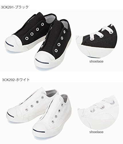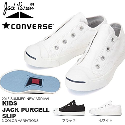 CONVERSE KIDS JACK PURCELL SLIP コンバース キッズ ジャックパーセル スリップ3CK291 3CK292 女の子・男の子・ジュニア・子供・子ども用キッズ ジャックパーセル スリップのカラー替えモデル。人気のホワイト(白)、ブラック(黒)の2カラー展開。スリップ仕様で、脱ぎ履きしやすいデザイン。足の曲がる位置でしっかり屈曲するソール設計と厚みのあるインナーフォームを使用し、内側からシューズと足元をやさしくサポート。カップインソールにはサイズ変更の目安が分かるフィッティングチェッカー付き。付属のゴアシューレースでも履ける2WAY仕様。
