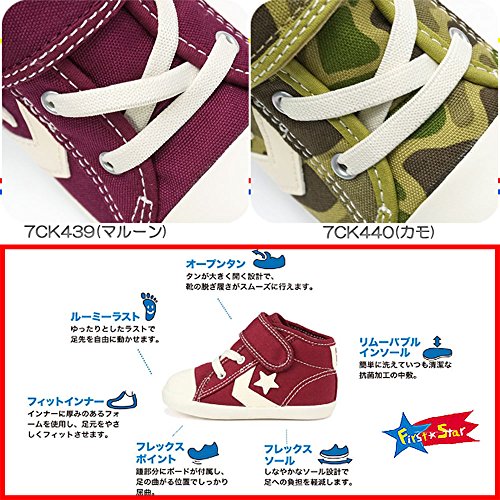 クラシックなマルーンカラーと男女ともに人気のあるカモ柄を採用した、ベビー キャンバス シェブロンスター N V-1。●クールなスタイルにもコーディネイトしやすいデザイン。●ミッドカットタイプで履き口にはパッドが付属し、足首全体をサポートする仕様。●しなやかなラバーに踵部分にはボードが付属し、足の曲がる位置でしっかりと屈曲するソール設計でシューズと足元をやさしくサポート。●カップインソールにはサイズ変更の目安が分かるフィッティングチェッカー付き。●ベルトタイプで脱ぎ履きしやすい。ファミリーペアモデル。●素材:アッパー:キャンバス アウトソール:ラバー●重量:100g(サイズ13.0cm片足で計測の場合。ご希望のサイズによって少しずつ変わります。)●かかとの厚み:約1cm●生産国:インドネシア●BABY CANVAS CHEVRONSTAR N V-1●