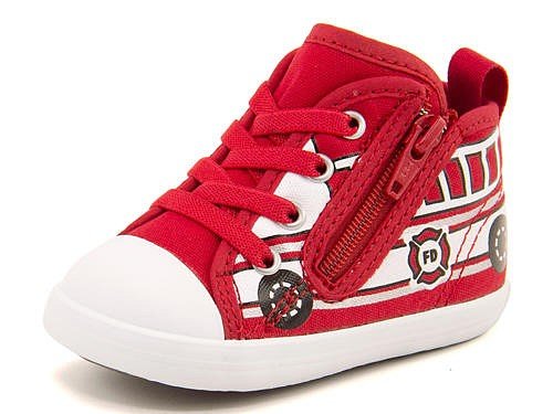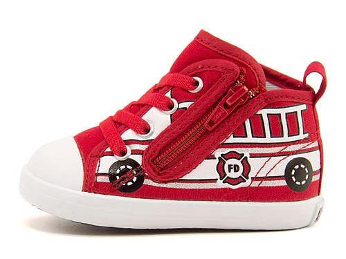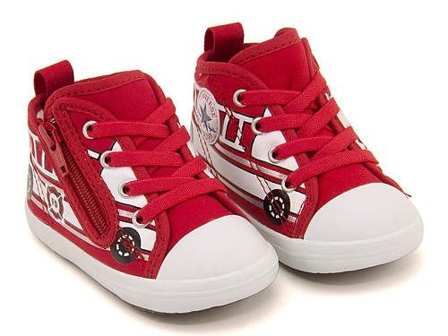ベビー オールスター Nのプリントアレンジモデル。毎シーズン人気のモチーフシリーズから車をイメージしたニューモデルが登場。イエローはスクールバス、レッドは消防車をイメージ☆ 縫付のゴムひも仕様で解ける心配がなく、サイドファスナーや履き口が大きく開くオープンタン、つまみやすい広めのかかとテープを合わせた、脱ぎ履きしやすいデザイン。足の曲がる位置でしっかり屈曲するソール設計と、厚みのあるインナーフォームを使用し、内側からシューズと足元をやさしくサポート♪ さらに足先ひろびろなルーミラストを採用しています。出産祝いやプレゼントとしても喜ばれること間違いなしです!※展開サイズ:キッズ