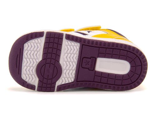 ベビーの足首をやさしくサポートするハイカットタイプのベビー ウエポン ハイに、発売当初のカラ—からシンプルなホワイトとクラシックなレイカーズカラーを採用。アッパーにはソフトなメッシュとシンセティックレザーを使用。2本のストラップで、履き口が大きく開くオープンタン設計で、靴の脱ぎ履きがスムーズです♪ しなやかなラバーに踵部分にはボードが付属し、足の曲がる位置でしっかり屈曲するソール設計。中敷は、取り外しが可能で簡単に洗え、いつも清潔に保てる抗菌仕様。ゆったりとしたルーミーラストで足先を自由に動かせます。※展開サイズ:キッズ