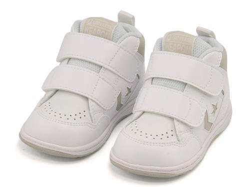 ベビーの足首をやさしくサポートするハイカットタイプのベビー ウエポン ハイに、発売当初のカラ—からシンプルなホワイトとクラシックなレイカーズカラーを採用。アッパーにはソフトなメッシュとシンセティックレザーを使用。2本のストラップで、履き口が大きく開くオープンタン設計で、靴の脱ぎ履きがスムーズです♪ しなやかなラバーに踵部分にはボードが付属し、足の曲がる位置でしっかり屈曲するソール設計。中敷は、取り外しが可能で簡単に洗え、いつも清潔に保てる抗菌仕様。ゆったりとしたルーミーラストで足先を自由に動かせます。※展開サイズ:キッズ